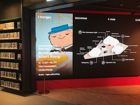 Vi frågade, men fick inget svar på, om barn varit involverade i planeringen av barnavdelningen. Vi hittade heller inga tydliga spår av barns möjlighet att påverka i form av förslagslådor eller enkäter men väl ett sätt att exponera teckningar. Vid vårt besök på Ode i Helsingfors 2019 hade vi ungefär samma tankar om barnperspektivet som Lena Lundgren och det kan inte hjälpas, Deichman Bjørvika slår Ode med hästlängder. Miljön på Deichman är mer lekfull, små alkover balanserar det storslagna, Ode verkar i jämförelse stelare i sin storslagenhet. På Deichman behöver barnen inte känna sig som ute på ett stort torg, mysfaktorn är helt enkelt högre. Vi tilltalades också av det lockande öppna magasinet som kan tänkas tilltala storläsare.